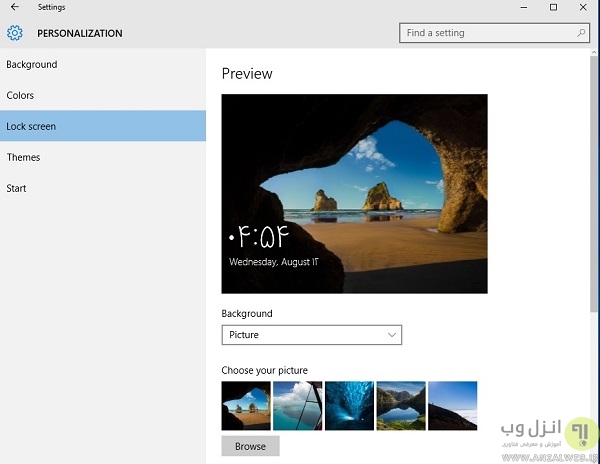 سپس با انتخاب گزینه Lock Screen و کلیک بر روی دکمه Browse یک تصویر را به دلخواه انتخاب کنید.