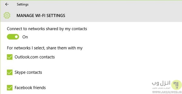 ویندوز ۱۰ قابیتی داد که شبکه  وای فای (WiFi) سیستم شما را با مجوز قبلی و عدم درخواست جدید با دوستان فیس بوک،اسکایپ،کانتک های اوتلوک و ...(Facebook,Skype,Outlook) به اشتراک میگذارد،برای غیر فعال کردن این قابلیت مسیر زیر را طی کنید: