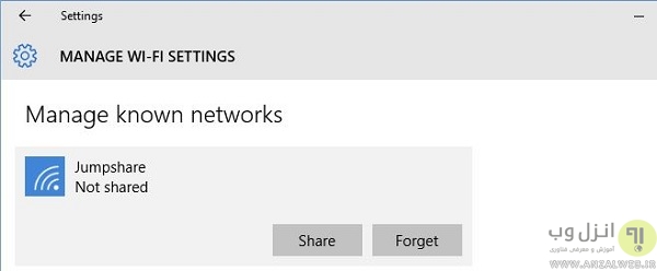 در این قسمت شما نام شبکه وای فای که الان به آن متصل هستید را مشاهده میکیند که دارای دو دکمه Share و Forget که کلیک بر روی دکمه اول برای به اشتراک گذاری وای فای و دکمه دوم برای فرام,ش کردن پسورد و خارج کردن این شبکه وای فای از لیست اتصال اتوماتیک به اینترت میباشد.