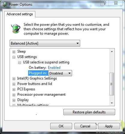 از پنجره باز شده بخش USB Setting را باز کنید و در قسمت USB selective suspend settings بخش Plugged in (برای لپ تاپ On battery) را بر روی Disable قرار دهید و پنجره ها رو OK کنید.