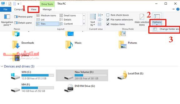 در ویندوز 10 بعد از باز کردن File Explorer ویندوز میتوانید با انتخاب سربرگ View در بالای پنجره و سپس کلیک بر روی آیکون مربوط به Options عبارت Change folders and search option را مشاهده خواهید کرد که با کلیک روی آن وارد folder option میشود.