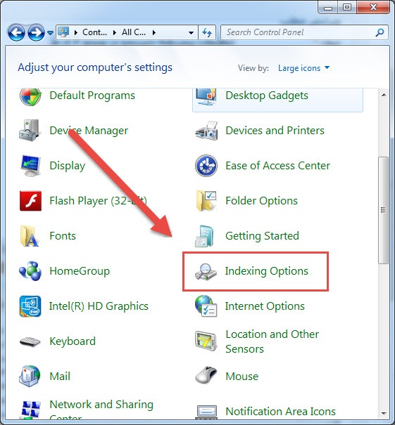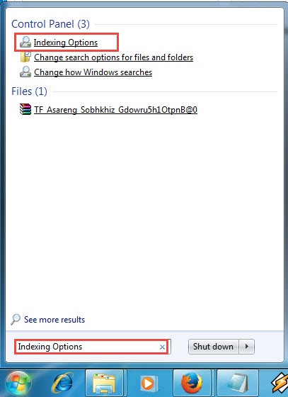 1- برای باز کردن پنجره Indexing Options می توانید از کادر جستجوی منوی استارت یا وارد شدن به کنترل پنل و کلیک بر روی آیکون Indexing Options استفاده کنید .