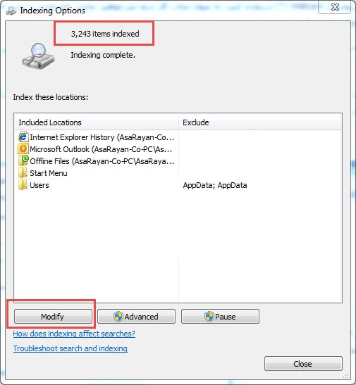 2- اگر به فایل های ایندکس شده در بالای صفحه دقت کنید در حال حاضر 3243 فایل ایندکس شده است . حالا من بر روی کلید Modify کلیک کرده و گزینه هایی که انتخاب نشده است را انتخاب میکنم .