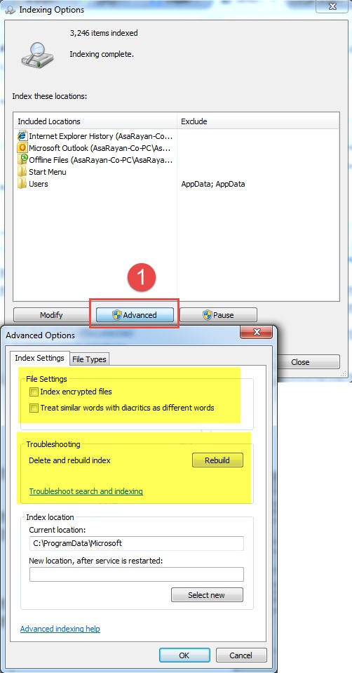 Indexing Options چیست و چه کمکی می تواند در جستجو به ما در ویندوز 7 کند ؟ به صورت پیش فرض در ویندوز 7 وقتی شما یک فایل یا پوشه یا هر فرمتی را جستجو می کنید فایلهای موجود در فولدرهای شخصی، نامههای الکترونیک موجود در نرمافزار Mail Client ، فایلهای Offline، IE History و همچنین منوی استارت و حساب های کاربری فعال به همراه اطلاعات آنها مورد بررسی قرار می گیرد . Indexing Options در همان ابتدا و طبق گزینه های مشخص شده یکسری فایل را ایندکس می کند تا در سریعترین زمان بهترین نتیجه را در اختیار شما قرار بدهد پس فقط در هنگامی گزینه های اضافی را فعال کنید که نتیجه ای از طریق جستجو دریافت نکرده اید زیرا انجام اینکار ممکن است در سرعت سیستم عامل شما تاثیر منفی بگذارد .