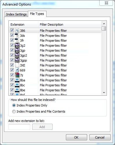 در تب File Types، تمامی Extensionها یا انواع فایلهایی که Index میشوند، فهرست شدهاست. میتوانید پسوند جدید دلخواهتان را به این فهرست اضافه یا گزینه مورد نظرتان را از آن حذف کنید.