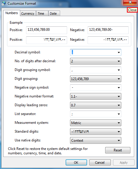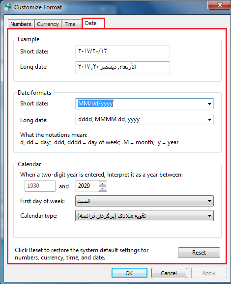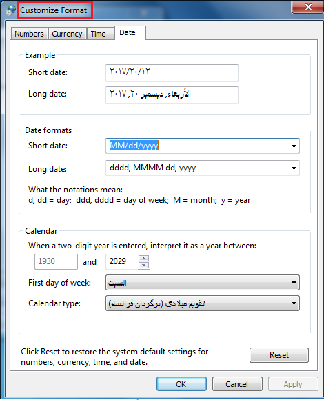 در این کادر میتوانیم فرمت های تاریخ و زمان را تغییر دهیم.