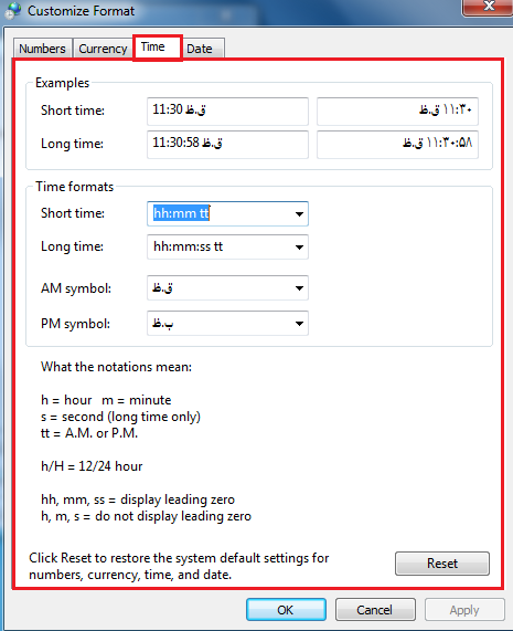 بر روی سربرگ Time کلیک چپ می کنیم. می توانیم فرمت ساعت را تغییر دهیم.
