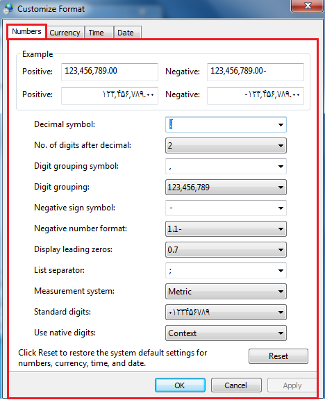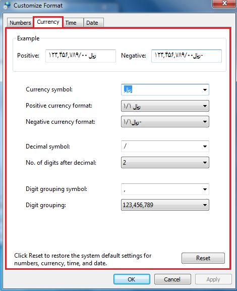 بر روی سربرگ Currency کلیک چپ می کنیم. در این کادر می توانیم واحد پولی و نوع نمایش آن را تنظیم کنیم.