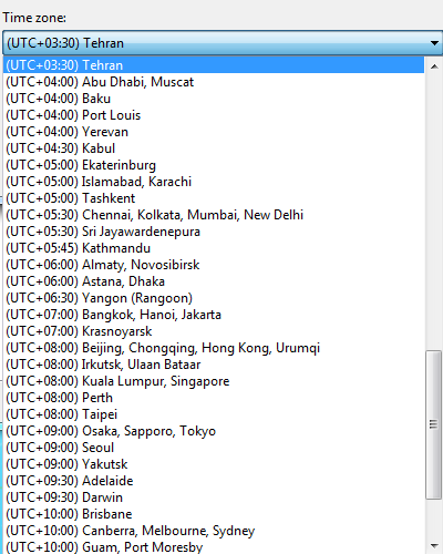 با کلیک بر روی فلش رو به پایین Select time zone منطقه زمانی مورد نظر را انتخاب می کنیم.