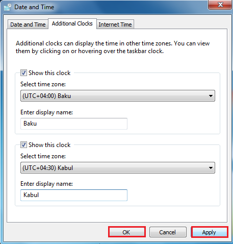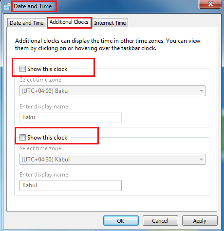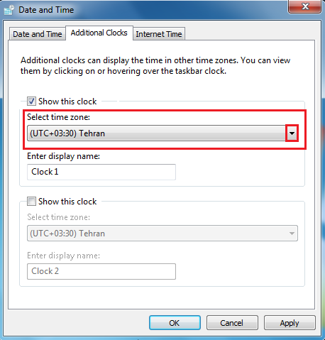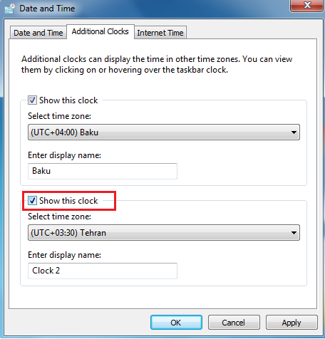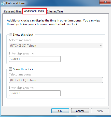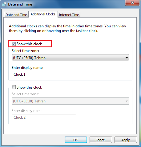 در صورت لغو کردن و حذف ساعت های ایجاد شده لازم است به پنجره Date and Time مراجعه کنیم و تیک گزینه Show this clock را نیز برداریم .و در انتها، جهت ذخیره تغییرات ابتدا بر روی Apply و سپس بر روی Ok کلیک نماییم.