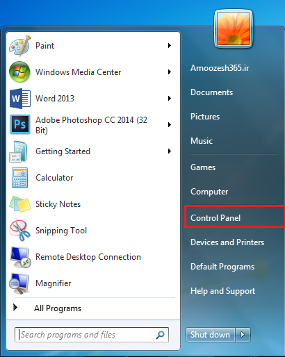 از منوی ظاهر شده از سمت راست پنل بر روی Control panel کلیک چپ می کنیم.