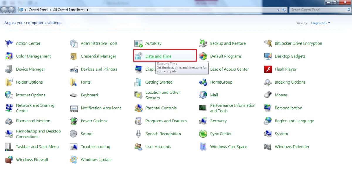 پنجره Control panel ظاهر می گردد. بر روی آیکن تصویر Date and Time کلیک چپ می کنیم.