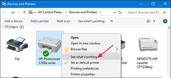 در پنجره Devices and Printers روی تصویر پرینتری که با آن مشکل دارید راست کلیک کنید و See what’s printing را انتخاب نمایید تا صف پرینت ظاهر شود.