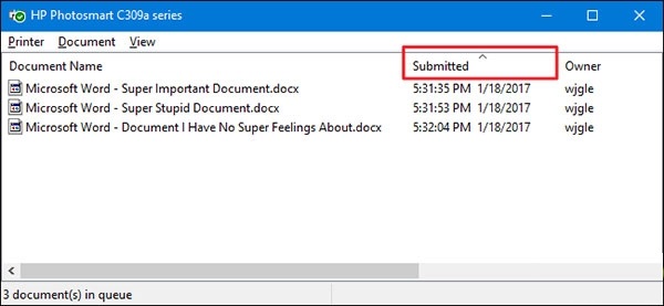 صف پرینت تمام فایل های در انتظار پرینت را به شما نشان می دهد. اگر تعدد فایل ها بالا است و نمی دانید کدام یک از فایل ها جلوتر از بقیه برای دانلود قرار دارند روی ستون Submitted کلیک کنید تا فایل ها به ترتیب زمان قرار گرفتن خود برای دانلود ردیف شوند.