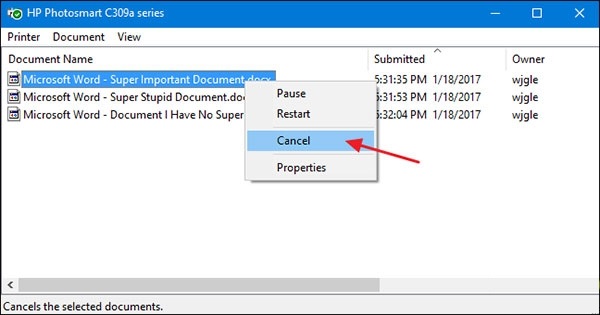 اگر با این کار هم موفق نشدید از فایل فعلی خود پرینت بگیرید باید پرینت تمام اسناد موجود را لغو کنید. به این منظور روی هر یک از فایل ها راست کلیک و این بار Cancel را انتخاب نمایید.