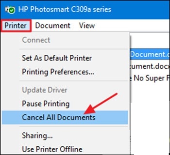در نهایت اگر باز هم با وجود لغو اسناد قبلی پرینت انجام نمی شود این بار تمام فایل های قبلی و فایل هایی که تازه وارد کرده اید را لغو و متوقف نمایید. بدین منظور از منو Printer گزینه Cancel all documents را انتخاب کنید.