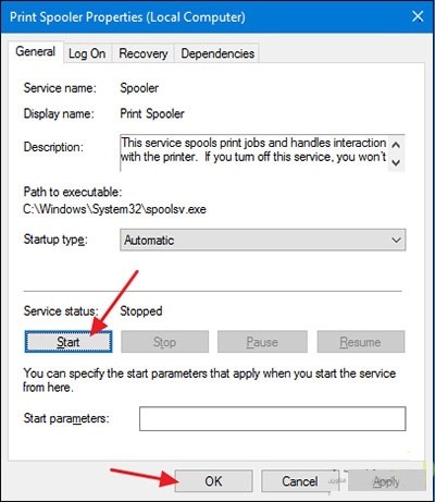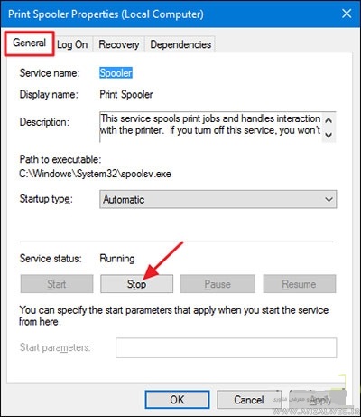 حال به پنجره properties که قبلا آن را باز گذاشته بودید برگردید و با کلیک روی گزینه Start مجددا سرویس Print Spooler  را فعال کنید.