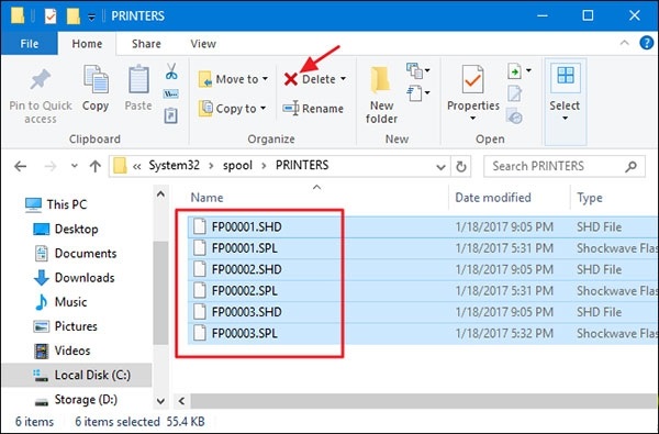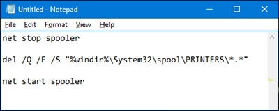 del /Q /F /S “%windir%\System32\spool\PRINTERS\*.*”