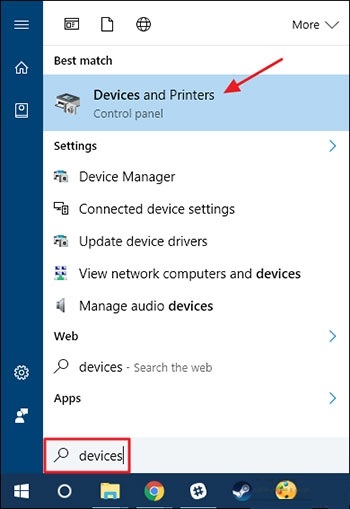 در بخش جستجو ویندوز کلمه devices را تایپ کنید و سپس Devices and Printers را از بخش کنترل پنل انتخاب نمایید.
