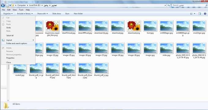 در پنجره Computer بر روی Organize کلیک کنید و گزینه ی Folder and search options را انتخاب نمائید.