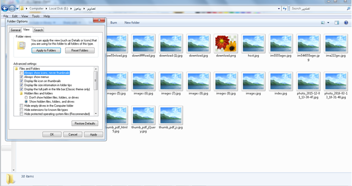 در تب View تیک گزینه ی Always show icons, never thumbnails را بردارید و OK کنید.