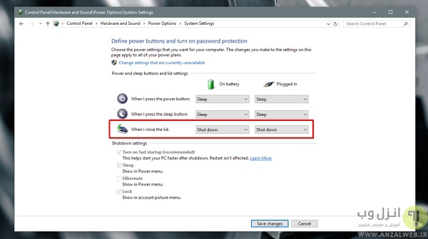 در پنجره بعدی می توانید انتخاب کنید که با فشار دادن دکمه پاور و یا با بسته شدن درب لپتاپ چه اتفاقی بیفتد. در قسمت پایین ‘When I close the lid’ گزینه Shutdown را برای هر دو حالت استفاده از باتری یا برق انتخاب کنید.