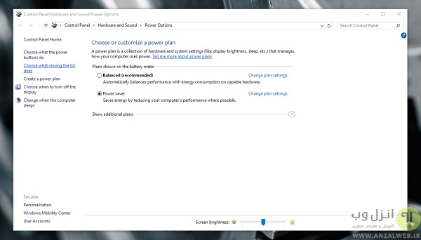 Control Panel\Hardware and Sound\Power Options بروید. سپس از قسمت چپ گزینه ‘Choose what closing the lid does’ را انتخاب کنید.