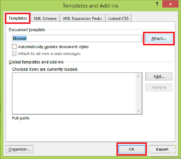 و اگر با مشکل تغییر فونت فقط کلمات انگلیسی در word مواجه هستید در پنجره باز شده از منو Add-Ins گزینه Templates را انتخاب کرده و Go را بزنید.