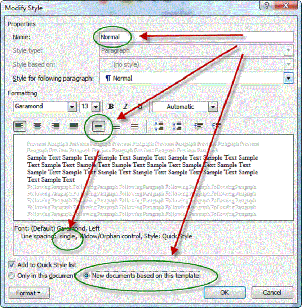 سپس خواهید دید که عنوان Normal است و فاصله بین خطوط روی حالت Single قرار داشته و گزینه New documents based on this template را انتخاب کرده و بعد OK را بزنید.