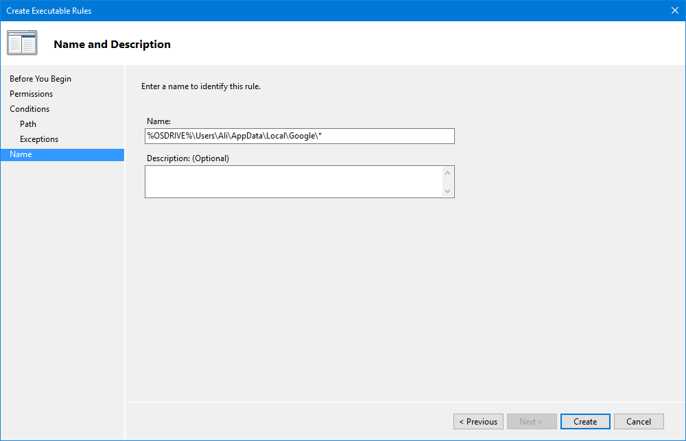مرحله Name می توانید توضیحاتی برای این قانون وارد کنید.