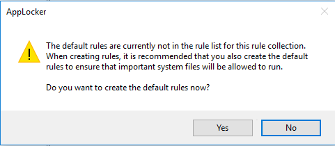 سپس بعد از کلیک بر روی Create پیغامی ظاهر می شود که می گوید قوانین پیش فرض هنوز ایجاد نشده اند. ایجاد قوانین پیش فرض برای اطمینان از اجازه راه اندازی فایل های سیستمی مهم اهمیت دارند. بنابر این در پاسخ به این پیغام روی Yes کلیک کنید.