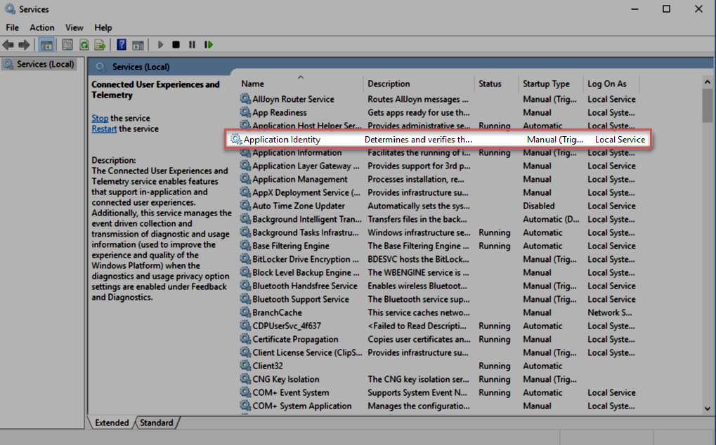 AppLocker دارای سرویسی در ویندوز میباشد که به صورت پیش فرض این سرویس غیرفعال میباشد و برای کار کردن با آن و اجرای AppLocker باشد ابتدا این سرویس را که Application identity نام دارد را Start کنید.