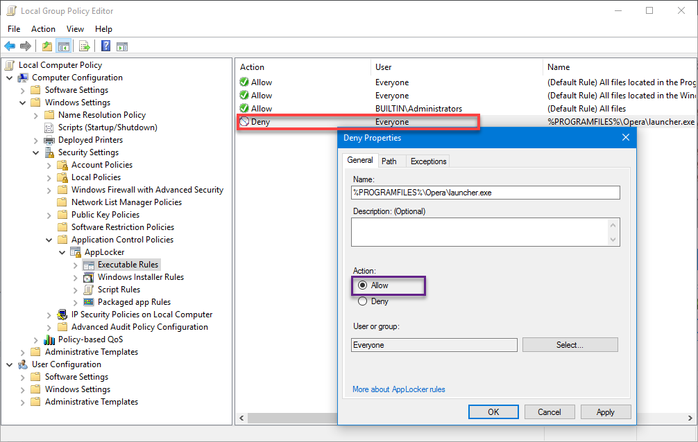 هر زمان که خواستید این قانون را برای این برنامه حذف کنید کافیست دوبار بر روی Deny کلیک کنید و در پنجره باز شده در قسمت Action بر روی حالت Allow قرار دهید.