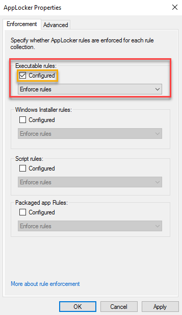 حالا در پنجره AppLocker Properties تیک گزینه Configured از قسمت Executable rules را فعال کنید.