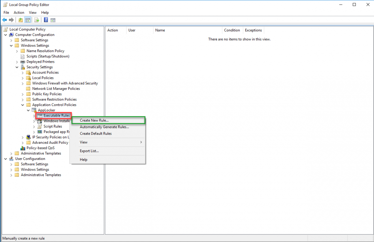 پس بر روی Executable Rule کلیک راست کنید و گزینه Create New Rule را انتخاب کنید.