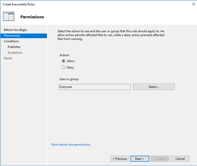 در قسمت User or Group می توانید تعیین کنید فقط برای چه کاربری از اجرای برنامه برای آن جلوگیری کند اگر می خواهید برای همه کاربران برنامه مورد نظر اجرا نشود بر روی همین حالت Everyone قرار دهید، اما اگر کاربر خاصی را مد نظرتان است کافیست بر روی select کلیک و نام کاربر مورد نظر را وارد کنید.