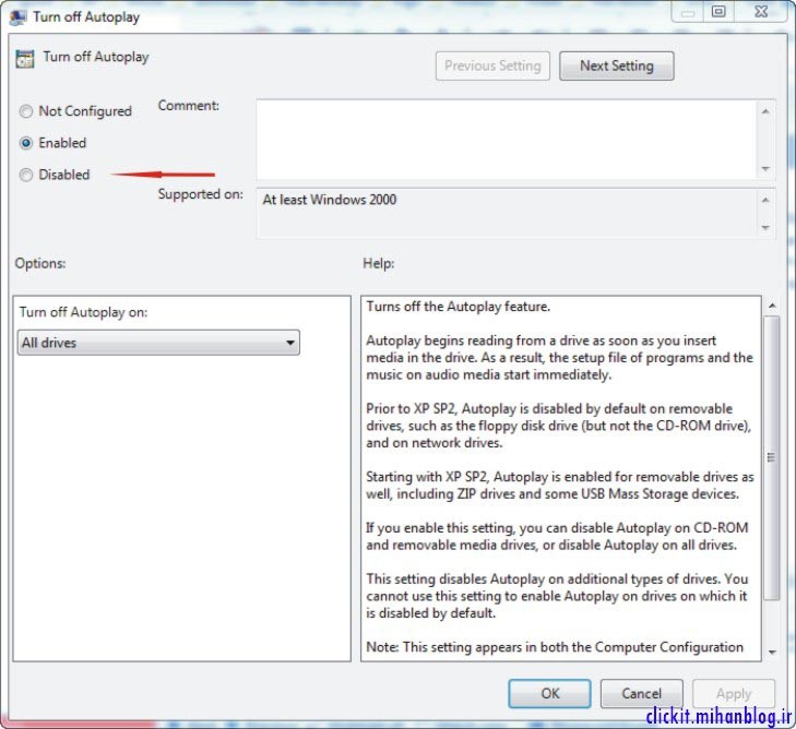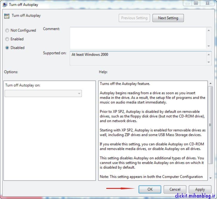 در صفحهی بازشده گزینهی Disabled را انتخاب کنید. با این کار ویژگی AutoPlay فعال میشود.