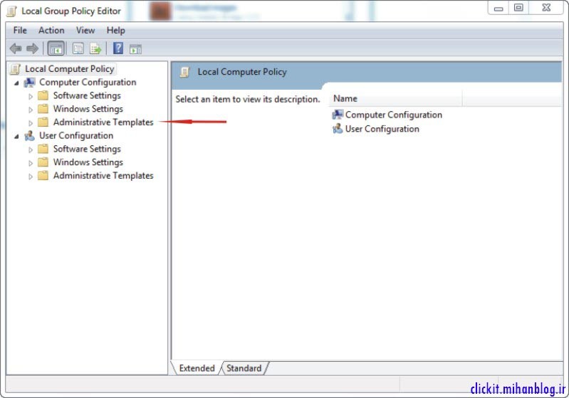 در پنجره باز شده از شاخهی Computer Configuration روی زیرشاخهی Administrative Templates کلیک کنید.
