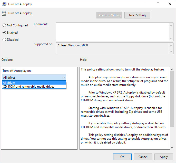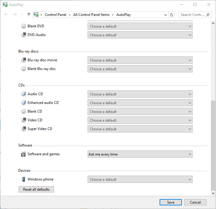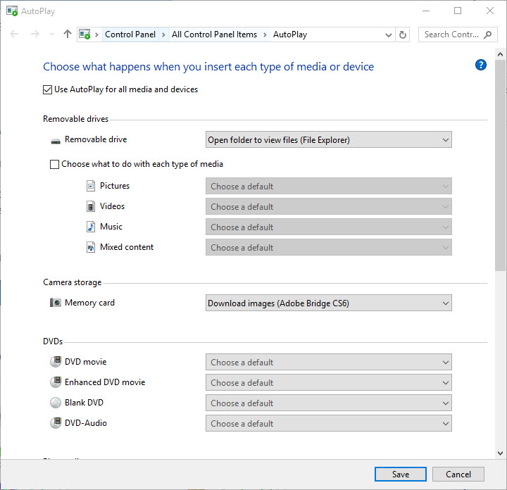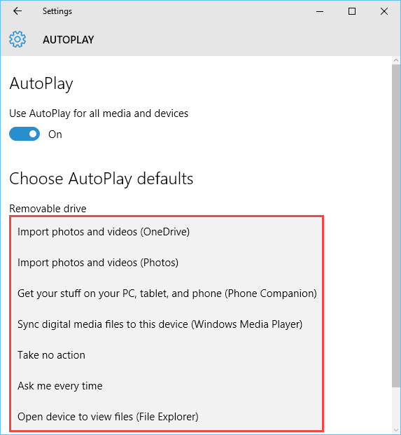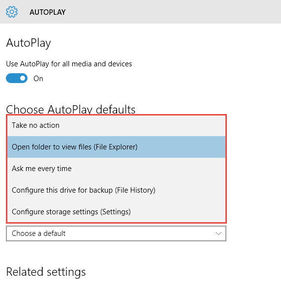 4. سه تنظیم دیگر را می توانید در تصویر زیر مشاهده کنید . اولین تنظیم Removable Drive می باشد . تنظیمات این گزینه مربوط به درایوهای خارجی می باشد . وقتی بر روی لیست کشوییی کلیک کنید تنظیمات مختلفی در اختیار شما قرار می گیرد . بهتر است گزینه پیش فرض را تغییر ندهید یا برای غیر فعال کردن از گزینه Take no action استفاده کنید تا وقتی درایوی اجرا می شود اتوران پنجره ای را نمایش ندهد .