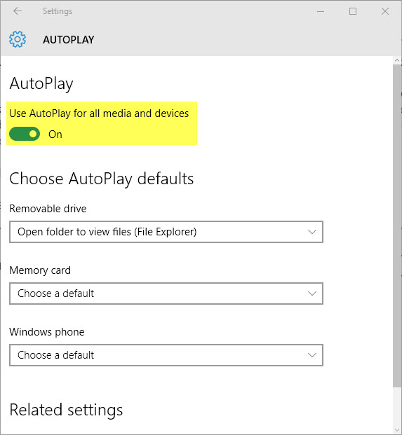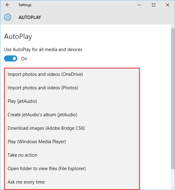 3. شما می توانید با غیر فعال کردن گزینه Use Autoplay for all media and devices تمام پنجره ها و تنظیماتی که به محض اتصال حافظه های جانبی به کامپیوتر نمایش داده می شود را غیر فعال کنید . برای غیر فعال کردن این قابلیت کافیست ON را برابر با OFF قرار بدهید .