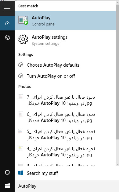 7. تنظیمات پیش رفته AutoPlay در کنترل پنل قرار دارد . برای باز کردن این تنظیمات ابتدا دستور AutoPlay را در کادر جستجو تایپ و بر روی کلید اینتر کلیک کنید .