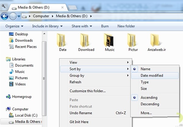 در درایو D جایی که تمام پوشه ها قرار دارند کلیک راست و از زیر منو گزینه Sort By گزینه Created Date را انتخاب کنید.خب حالا تمامی پوشه های این قسمت بر اساس تاریخ ایجاد به صورت نزولی مرتب شدند (با کلیک بر روی نام ستون Date Modified و تغییر فلش رو به بالا میتوانید نحوه نمایش را را به صعودی تغییر دهید) اما هیچ تغییری در نحوه نشان دادن زیر پوشه های آنها انجام نشده است.