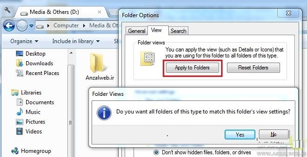 سپس در پنجره باز شده تب View را انتخاب و بر روی دکمه Apply to Folders کلیک و گزبنه Yes را از پیغام نمایش داده شده انتخاب کنید تا تنظیماتی که برای این بخش نمودید به صورت خودکار بر روی همه زیر پوشه ها و فایل های این درایو اعمال شود!