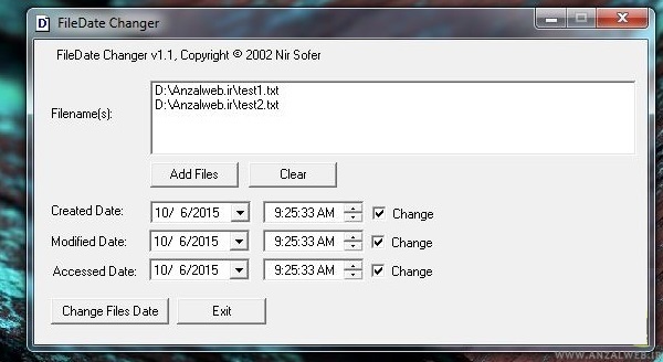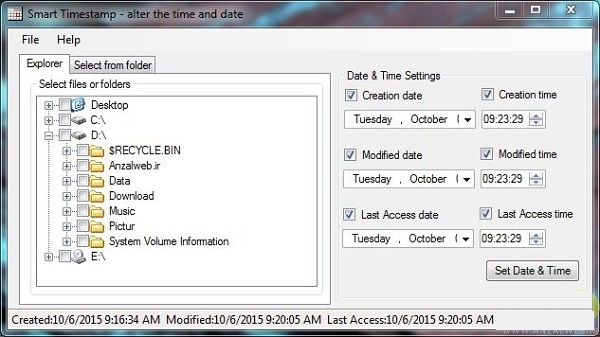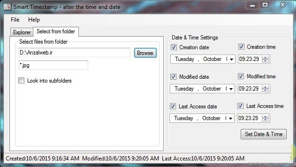این برنامه دارای قابلیت تغییر تاریخ ایجاد فایل و پوشه ها (Creation Date)،تاریخ و زمان آخرین دستکاری پوشه و فایل (Modified Date) و آخرین زمان و تاریخ دسترسی به فایل و پوشه (Last access Date) را داراست و میتوانید براحتی زمان و تاریخ مورد نظر خود را انتخاب و آن را بر روی جمعی از فایل و پوشه های سیستم خود اعمال کنید.