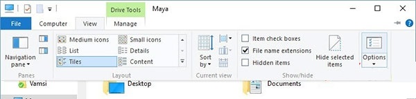 راه دیگری که در انزل وب معرفی خواهیم کرد ، استفاده از folder options می باشد. این روش نیز مشابه روش قبلی ساده و سریع است. برای این کار ابتدا با استفاده از کلید های ترکیبی Win + E ، فایل اکسپلورر را باز کنید و سپس از تب view ، گزینه ی option را انتخاب کنید.