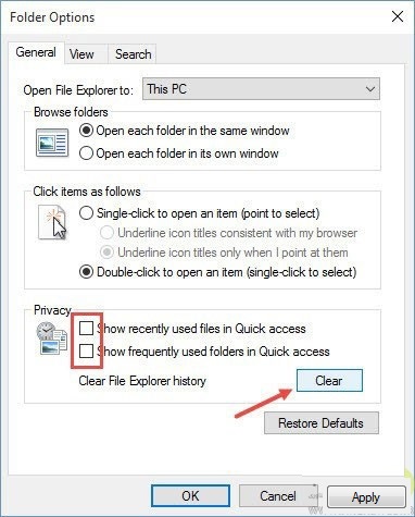 در صورتی که نمی خواهید این عمل سبب پاک شدن تاریخچه ی فایل ها و فولدر های شما شود ، تیک دوگزینه ی موجود زیر تب privacy را بردارید.