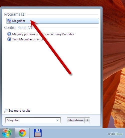 قدم دوم: وقتی نرمافزار Magnifier در نتایج جستوجو ظاهر شد، روی آن کلیک کنید تا اجرا شود. در ابتدای اجرا، صفحه در حالت بزرگ شده قرار میگیرد که با کلیک بر روی علامت منفی مجدداً کوچک خواهد شد.