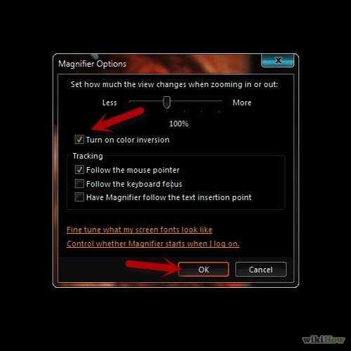 قدم سوم: روی علامت چرخدنده کلیک کنید تا تنظیمات ذرهبین باز شود. گزینهای به نام Turn on color inversion در دایلاگ باکس باز شده وجود دارد که کار آن معکوس کردن رنگهاست. چکباکس آن را انتخاب نمایید تا رنگها معکوس شوند. با کلیک روی گزینهی Ok خارج شوید.