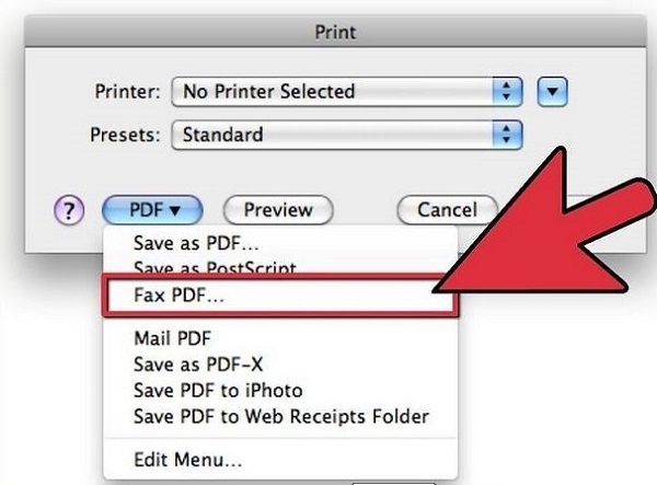 دکمه PDF را کلیک کنید و از منوی پاپ آپ گزینه Fax PDF را انتخاب کنید.