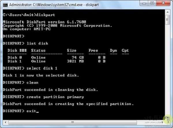 select disk 1 تایپ و اینتر و بعد از آن